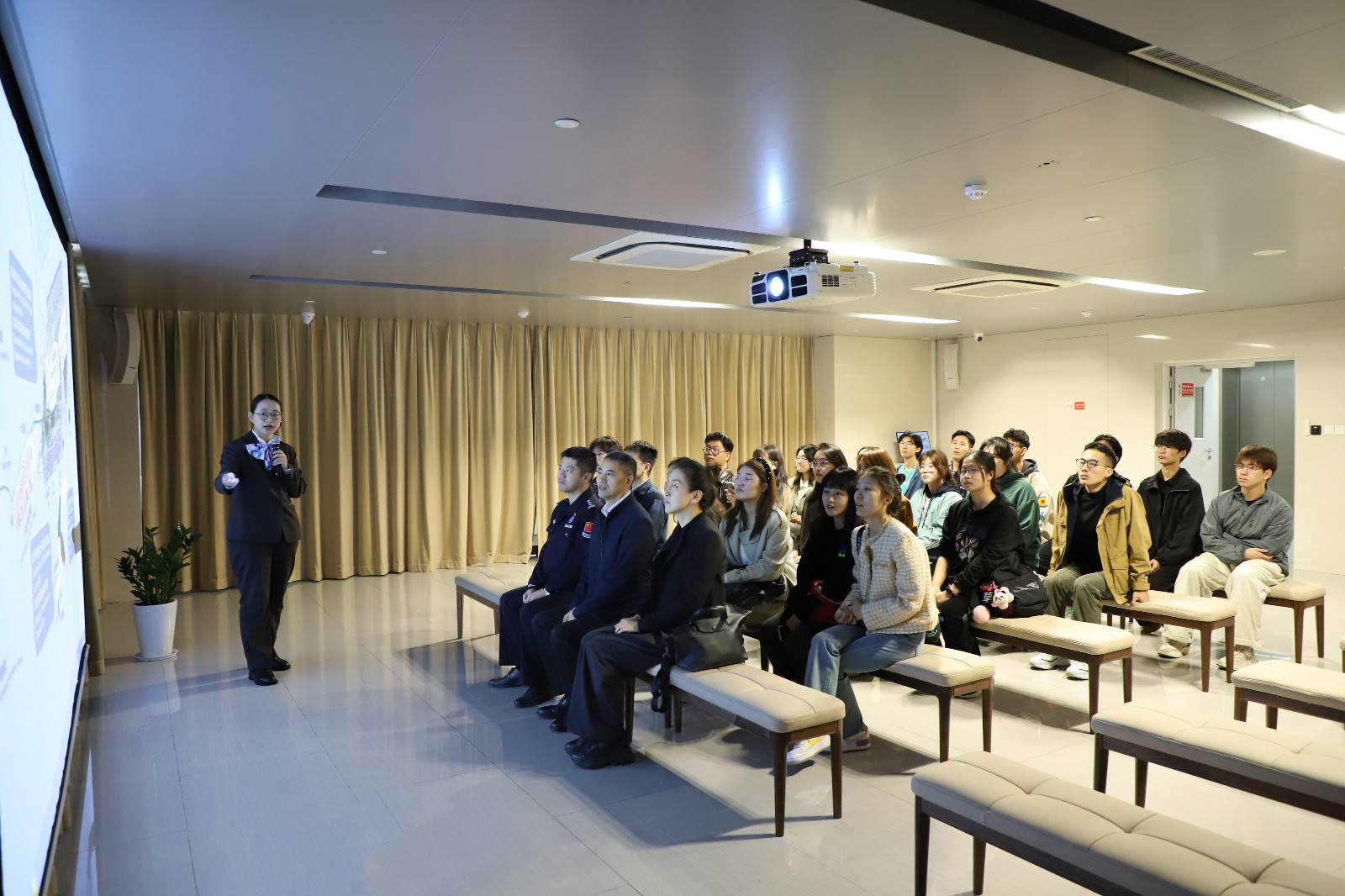 第一站,师生们来到了洋山四期自动化码头的参观区域。在工作人员的引领下,大家首先观看了洋山港四期的官方宣传片。影片中,高科技的自动化装卸系统、智能调度的繁忙景象、以及绿色环保的运营理念,一幕幕生动展现,令在场的师生们震撼不已。