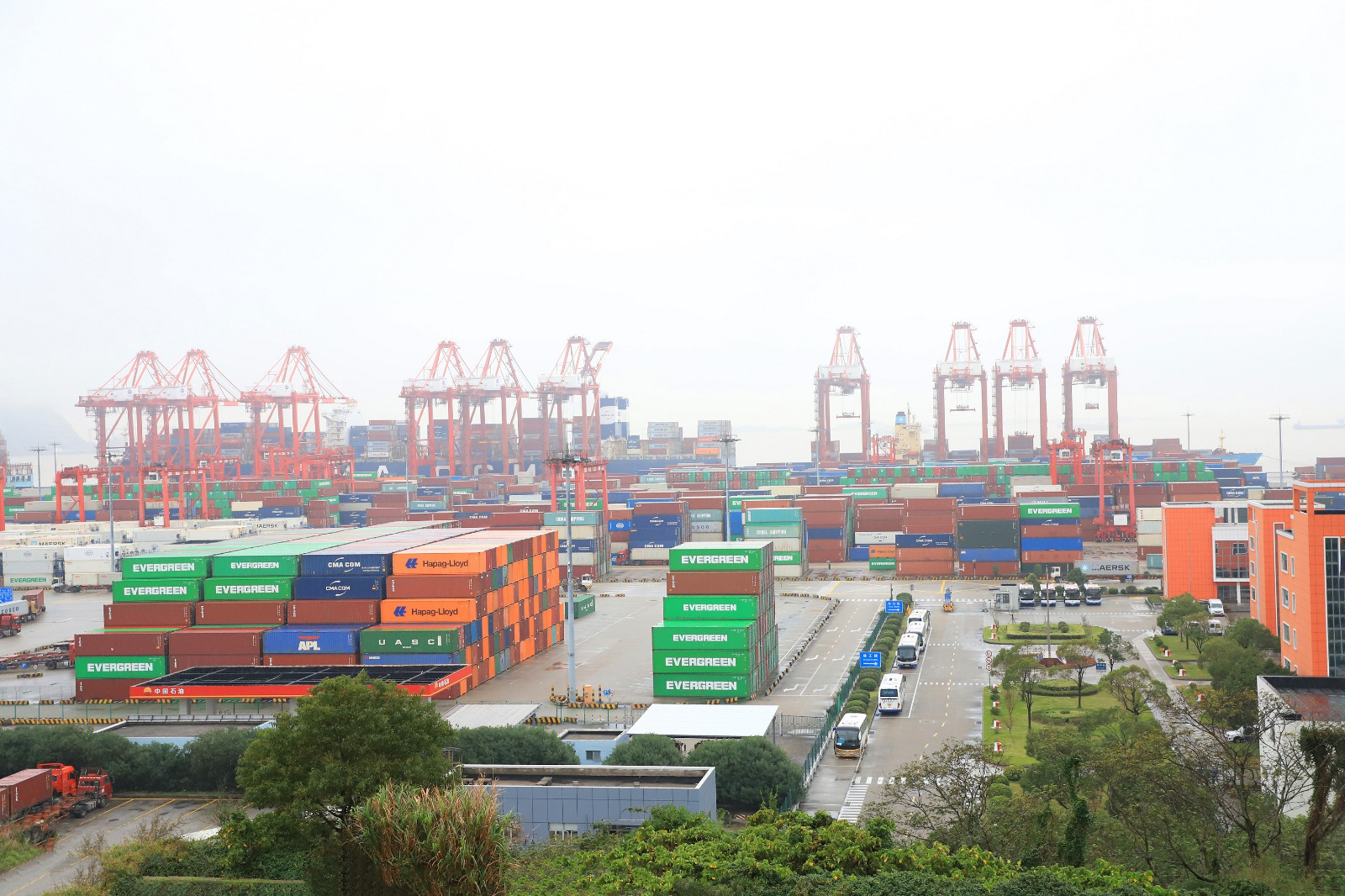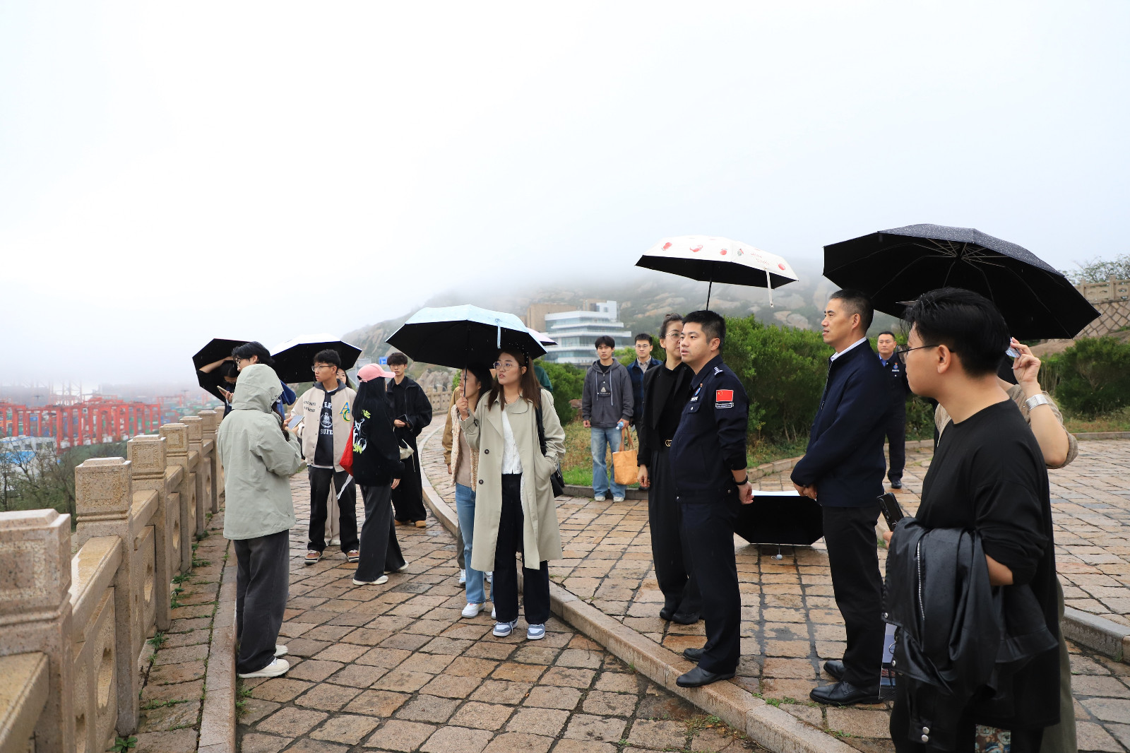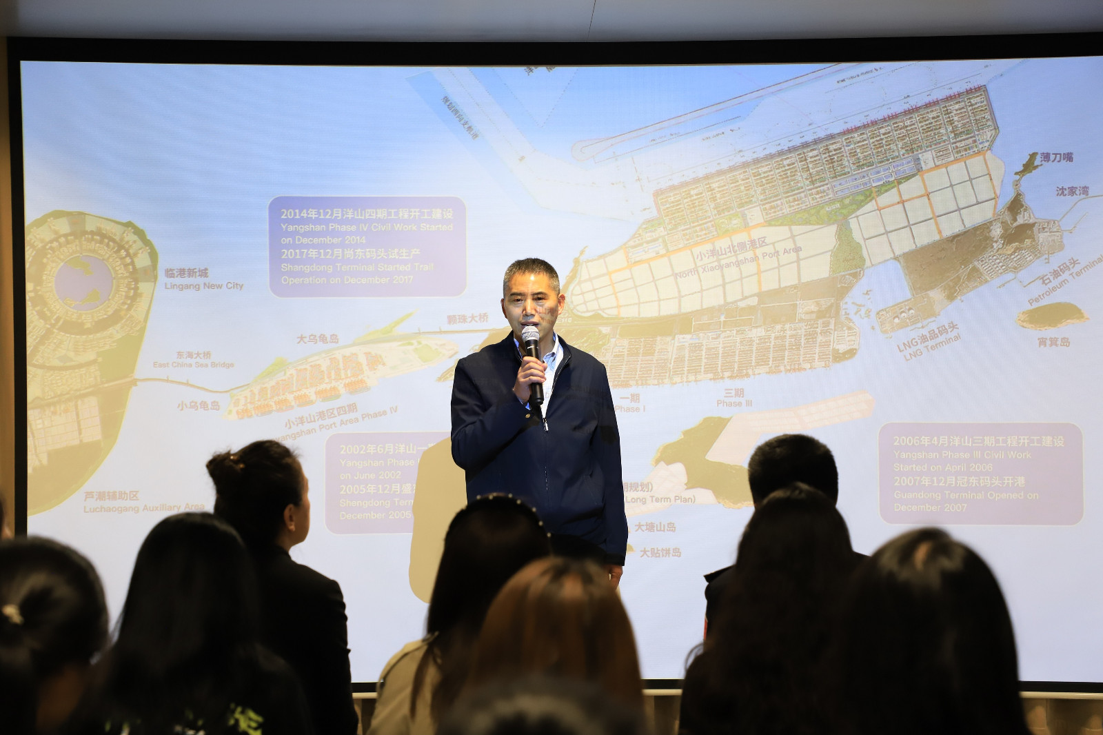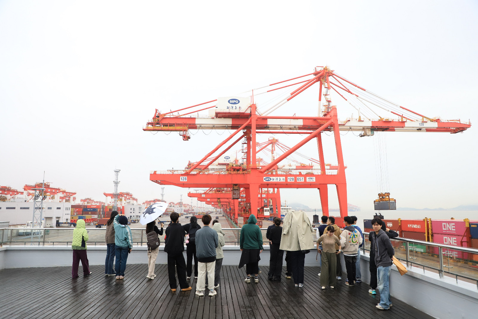 当日,上海的天空飘着绵绵细雨。学院的师生们满怀期待地搭乘大巴前往洋山港,当车辆初驶上东海大桥时,云雾缭绕之中,巨大的发电机设施时隐时现,为整个洋山港披上了一层神秘的面纱。大巴车刚登陆洋山岛,一排排整齐划一的集装箱如积木般矗立,蔚为壮观,瞬间点燃了大家的热情,同学们纷纷掏出手机,记录下这难得一见的场景。