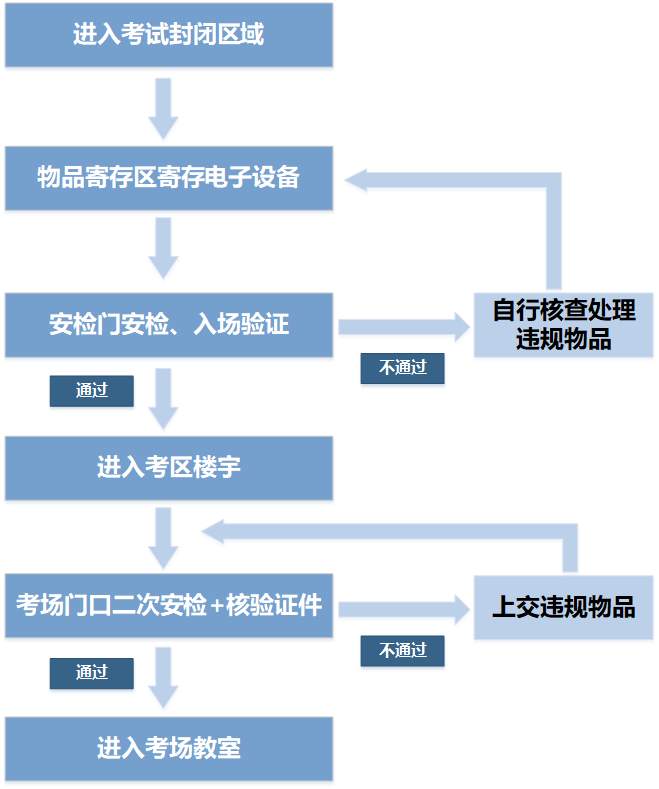 2.下午考试入场及相关安排:考生凭纸质版《准考证》与有效居民身份证件原件进入考点——按下图示意路线进入相应考区——预计12:45开始在寄存区寄存手机等电子产品—排队有序通过安检门安检——13:00开始经身份验证进入考试楼宇——14:00正式开考。